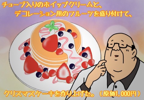呆然とする妻に『ケーキは今用意するから』 と優しく声をかけ、キッチンへ行くと、おじさんはホットケーキを焼き始める。
