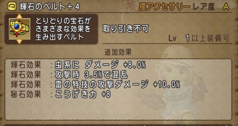 虫系が確定したので、『虫系にダメージ〇%』のベルトは用意しておいて良いかも♪