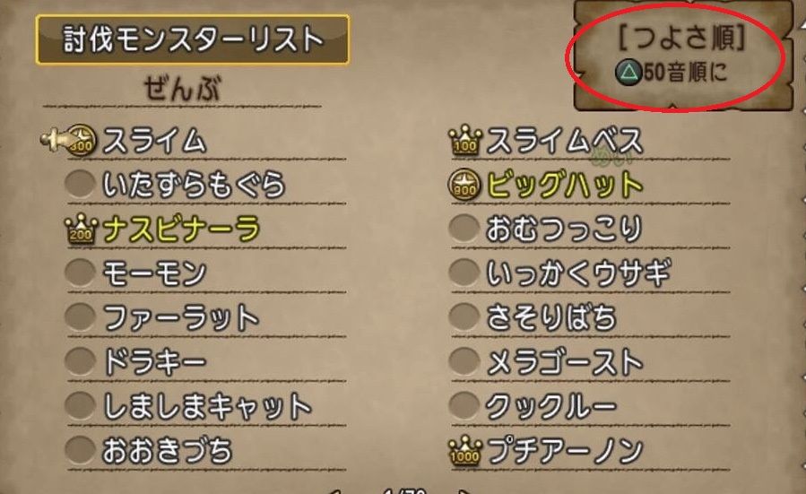 『△ボタン(PS4)』を押すと、『つよさ順』に並び替える事ができます。