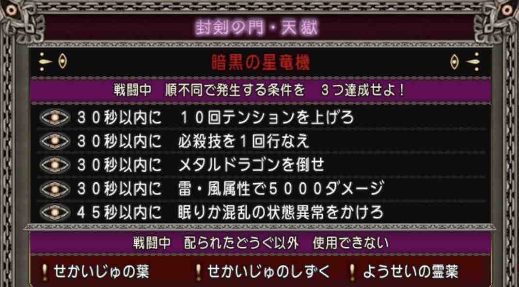① 30秒以内に 10回テンションを上げろ:ためる弐(武)・バト(特技・証・必殺技)・荒神の舞(踊必殺技)・魔術師のタロット(占)・機神の眼甲(味方死亡時テンションアップ)・テンション系宝珠など