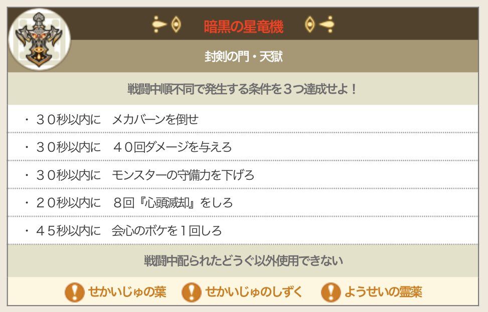 ③ 30秒以内に モンスターの守備力を下げろ:ルカニ&ルカナン(旅・ブメのデュアルブレイカーから短剣で成功率UP?)、かぶと割り(オノ)、鉄甲斬(オノ)、プレートインパクト(ハンマー)、ウデ錬金、疾風のジャマダハル(ツメの基礎効果)